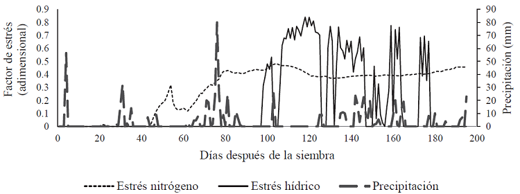 Con el propósito de analizar el potencial de CERES-Maize para evaluar la producción de maíz, en términos de la duración del ciclo de cultivo y los estreses por nitrógeno y humedad del suelo, se utilizaron los coeficientes genéticos calibrados para materiales híbridos, así como el manejo de cultivo, las condiciones climatológicas durante 2009 y las características del suelo (regosol eútrico) de la comunidad de Etlatongo. En la Figura 4 se muestra a nivel diario la relación entre precipitación y los estreses por humedad y nitrógeno del suelo. Los estreses por agua y nitrógeno toman valores de cero a uno, correspondiendo a cero condiciones óptimas, sin estrés, y a uno condiciones de máximo estrés. Se puede observar que a partir del día 60 el estrés por nitrógeno aumenta conforme ocurre el crecimiento vegetativo, hasta alcanzar valores de 0.5 de deficiencia de nitrógeno; problema que persiste durante la floración y llenado de grano. Por otro lado, a partir del día 100, cuando son mayores las necesidades de agua por parte del cultivo, el estrés hídrico alcanza valores cercanos a 0.9, con altibajos en función del intervalo de lluvias y la magnitud de los eventos.