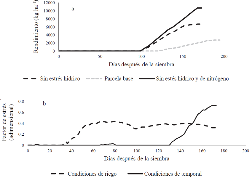 En la Figura 5a se compara la predicción de rendimiento de grano, correspondiente a las condiciones de manejo y climáticas de 2009 para la localidad de Etlatongo, con un escenario sin restricciones de humedad y otro escenario sin restricciones de humedad y nitrógeno. Para eliminar el estrés hídrico se simuló condiciones de riego automático y para reducir el estrés por nitrógeno se incrementó la dosis de fertilización a 120 kg ha-1, la cual se dividió en 50% a la siembra y 50% a los 100 días de esta. Al eliminar el estrés, CERES-Maize reporta un incremento de rendimiento de grano por arriba de 4.0 Mg ha-1 y una reducción en el ciclo de cultivo en 22 días. Esto coincide con los resultados de Flores et al. (2013) quienes reportan, para parcelas sin estrés, incrementos de maíz en más de 5 Mg ha-1.
