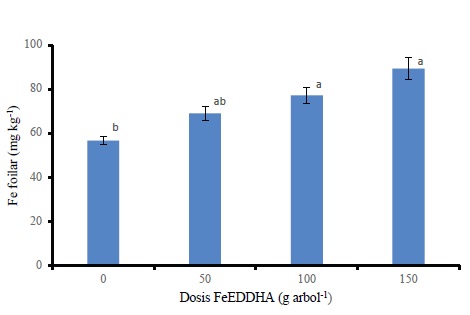 En la Figura 2 se presenta el contenido de hierro total en hojas de árboles de limón italiano tratados con diversas dosis de quelato FeEDDHA aplicado al suelo. Estos árboles mostraban inicialmente síntomas visuales de deficiencia de este micronutriente o clorosis férrica, es decir un amarillamiento severo y persistente de las hojas nuevas debido a las condiciones calcáreas del suelo y al bajo contenido de Fe disponible para los árboles. Como se puede observar (Figura 2) los árboles control presentaron una baja concentración de Fe (58 mg kg-1) mientras que los que recibieron las dosis de 50 y 100 g árbol-1 de FeEDDHA, cinco meses atrás, aumentaron significativamente la concentración foliar de Fe hasta niveles óptimos 69 y 77 mg kg-1 Fe respectivamente (Emblenton, Jones, Labanauskas y Reuther, 1973). En los árboles tratados con la dosis de 150 g árbol-1 de FeEDDHA, aunque el contenido de Fe foliar aumentó ligeramente (89.4 mg kg-1 Fe) el incremento no fue significativo en comparación con el contenido foliar de hierro de los árboles adicionados con 100 g árbol-1 de FeEDDHA. Resultados similares encontraron Rajaie y Tavakoly (2018) quienes señalan que la aplicación de FeEDDHA al suelo en dosis de 75 g árbol-1 incrementó la concentración de hierro en las hojas de árboles de naranjo valencia crecidos en suelos calcáreos. Lo anterior sugiere que bastaría con aplicar una dosis de entre 50 y 100 g árbol-1 FeEDDHA al suelo para corregir la deficiencia de hierro en árboles de limón italiano plantados en suelos calcáreos.