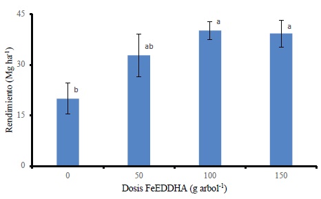 El rendimiento de fruto en los árboles de limón italiano aumentó significativamente con la aplicación de FeEDDHA al suelo (Figura 3). En los árboles sin tratar con FeEDDHA la producción de fruto fue de casi 20 Mg ha-1 mientras que con la aplicación de 50 g árbol-1 de FeEDDHA el rendimiento se incrementó a casi 33 Mg ha-1; con la dosis de 100 g árbol-1 la producción llegó a más de 40 Mg ha-1, el doble del rendimiento obtenido en los árboles sin tratar. El aumento de la dosis de quelato de 100 a 150 g árbol-1 de FeEDDHA no incrementó significativamente la producción de fruta ya que el rendimiento fue casi igual que cuando se aplicaron 100 g árbol-1 de FeEDDHA. Estos resultados indican que la aplicación de FeEDDHA al suelo corrigió la clorosis férrica de los árboles de limón italiano y aumentó la producción de fruto cuando se adicionaron dosis del quelato entre 50 y 100 g árbol-1; la aplicación de una dosis mayor no incrementó significativamente la producción por lo que sería innecesario agregar cantidades superiores a 100 g árbol-1 de FeEDDHA.
