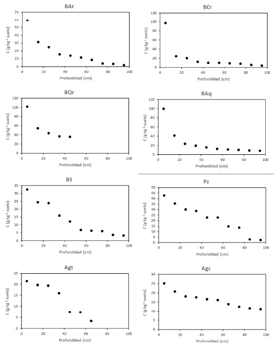 Los perfiles de la distribución del COS para los diferentes usos del suelo están mostrados en la Figura 1.