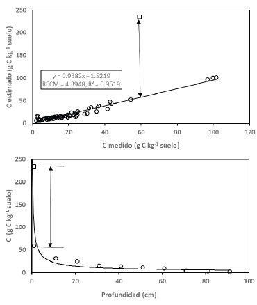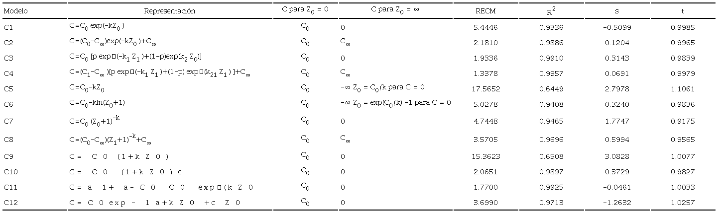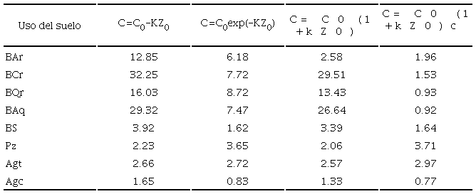 En el caso de los modelos logarítmicos y potenciales, el valor del COS tiende a infinito (modelos potenciales) o no está definido (modelo logarítmico) para el caso de Z = 0. Si se consideran profundidades de estratos de 10 cm de espesor, podemos definir el valor de C0 para el caso de Z = 5 cm (mitad del primer estrato), de tal manera que la profundidad estará definida por Z0 = Z- 5. Para los modelos logarítmicos y potenciales, para evitar el problema en el origen de Z0, se utilizó el valor Z0 + 1 (el logaritmo de cero no está definido) para definir el origen de la profundidad.