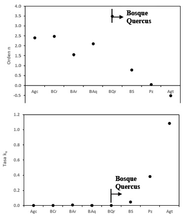 En la Figura 7 se muestra las relaciones entre los diferentes usos del suelo y el orden n y tasa de reacción kn. Para la secuencia de perturbación del bosque de encino, todo el perfil, el orden n disminuye y la tasa de reacción kn se incrementa a medida que el nivel de perturbación aumenta.