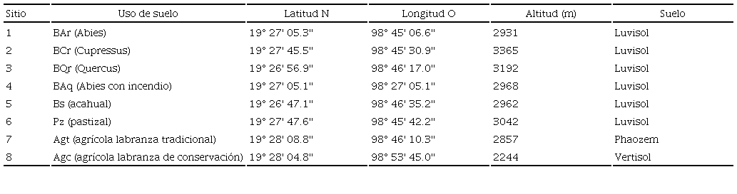 Para caracterizar los patrones de la distribución del COS a profundidad se analizó una secuencia de perturbación en un bosque de encino (Quercus sp.): bosque de Quercus (BQr), bosque secundario o acahual de Quercus (BS), pastizal de más de 25 años de establecido (Pz) y agrícola con labranza tradicional de más de 15 años de establecido (Agt). Adicionalmente se consideró el análisis de la distribución vertical del COS en un bosque de Abies: bosque de Abies (BAr) y bosque de Abies con un incendio ocurrido hace más de 15 años (BAq). Como contexto, se analizó un bosque de Cupressus (BCr). La letra r es para denotar un bosque de referencia (bosque no perturbado o con perturbación mínima) para tener un estándar de comparación. El área de ubicación de los sitios de muestreo está localizada en el monte Tláloc en el municipio de Texcoco, Estado de México, México. El clima en la zona de estudio es semifrío subhúmedo en las partes altas, donde se localizan los bosques de Abies, Cupressus y Quercus, pastizal y acahual (INEGI, 2008).