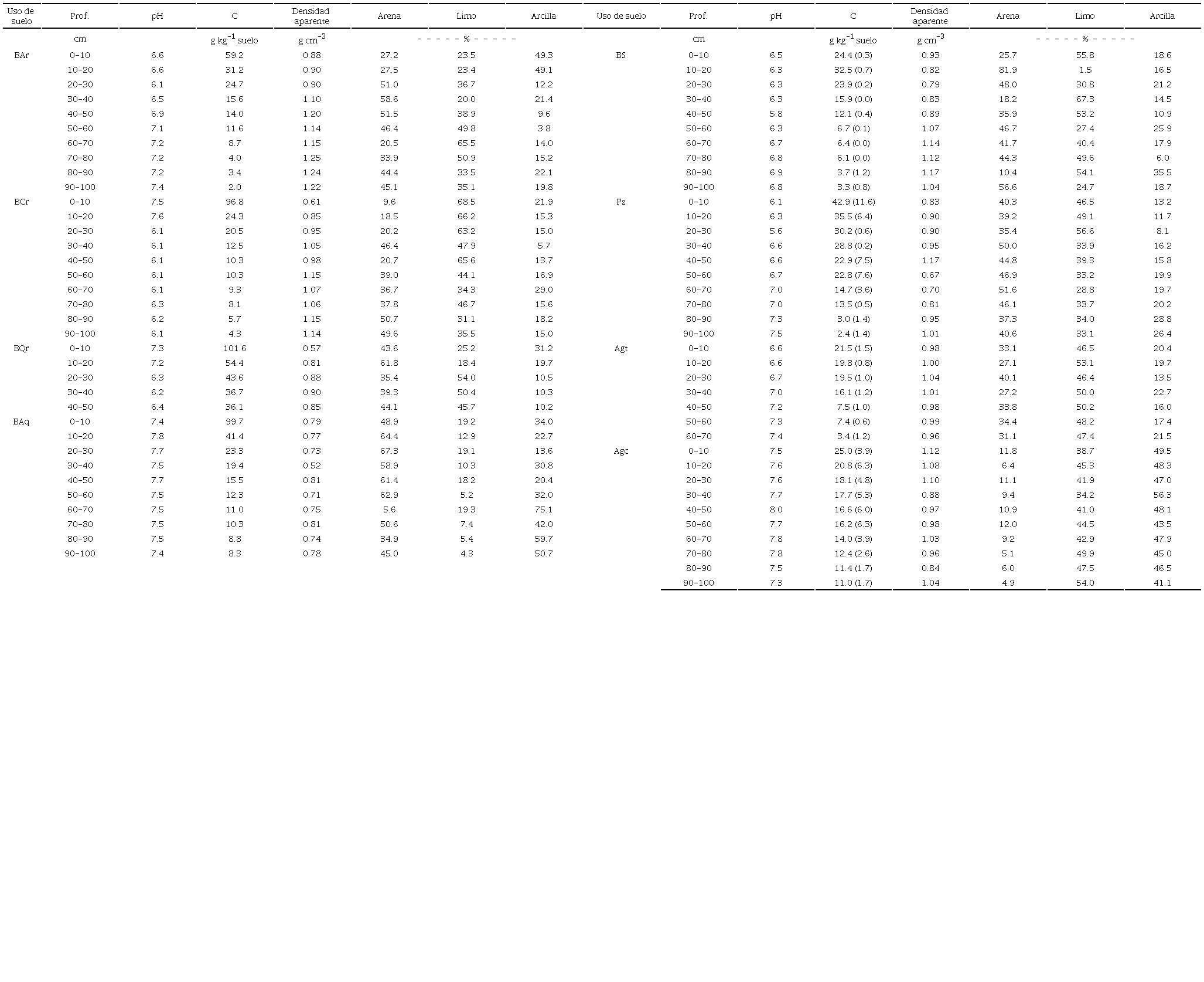 En los sitios de muestreo se determinó la densidad aparente (DAP) con el método del cilindro, cada 10 cm hasta 1 m de profundidad. Se determinó el pH con un potenciómetro (Conductronic pH 20) y se analizó la textura con el método de la pipeta (Burt, 2004).