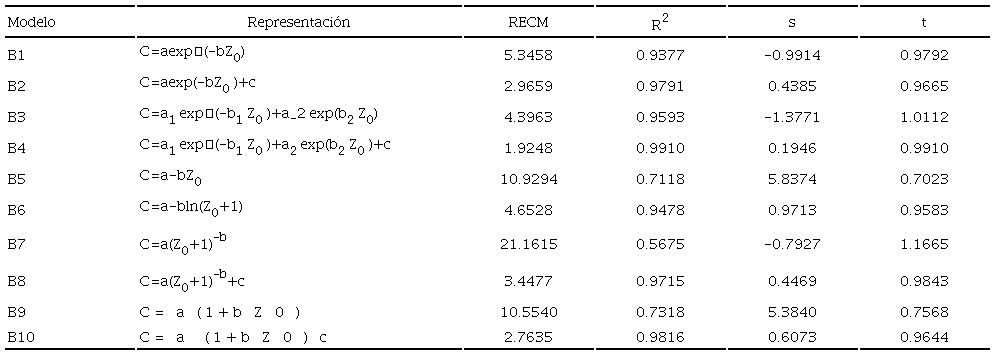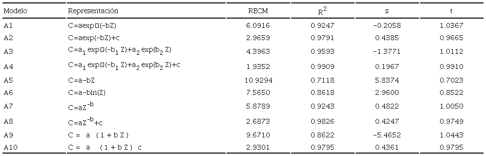 Condicionando los ajustes de regresión no lineal a C = C0 (estrato más superior) cuando Z0 = 0 (C0 no es un parámetro de estimación), en el Cuadro 5 se muestran los resultados obtenidos.