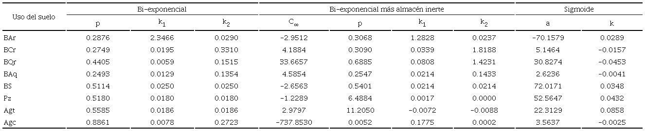 El condicionamiento introducido permite definir bases fisicoquímicas para la interpretación de los parámetros de los modelos analizados, pero sujetos a ajustes por regresión no lineal de los mismos. En el Cuadro 6 se muestran los parámetros de los tres mejores modelos, para cada uso del suelo analizado. En el caso del modelo sigmoide, los parámetros muestran valores positivos y negativos de a y k que resultan difíciles de interpretar sin considerar un modelo de distribución vertical del COS. El modelo bi-exponencial más almacén inerte tiene valores negativos para C∞, por lo que su ajuste es artificio de la regresión no lineal. Finalmente, el modelo bi-exponencial muestra patrones contrarios para los usos del suelo BAr y Agc, dado que el almacén 1 es más lábil (se descompone más fácilmente) que el almacén 2, por lo que sus parámetros son resultados de la regresión no lineal. En resumen, aunque los modelos tienen ajustes experimentales altamente significativos (R2 > 0.99), estos muestran incongruencias en sus parámetros.