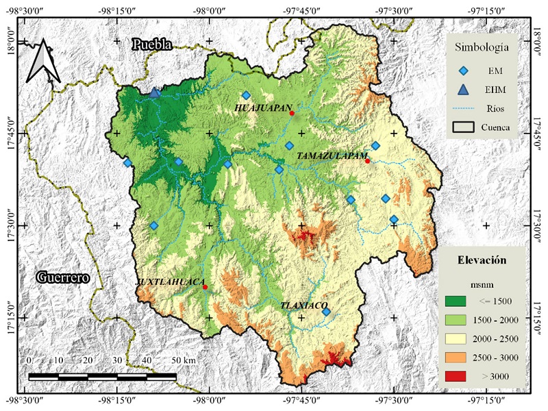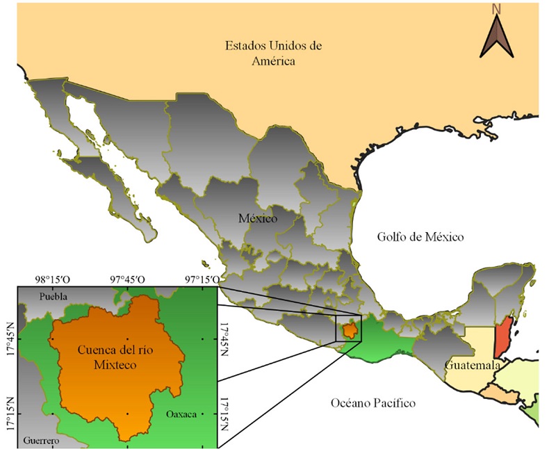 La cuenca del río Mixteco se localiza en el noroeste del estado de Oaxaca, cubriendo una superficie total de 6 559.20 km2 (Figura 1). De acuerdo con la Comisión Nacional del Agua (CONAGUA), esta cuenca forma parte de la Región Hidrológica del Río Balsas (RH18) (CONAGUA, 2020), su cauce principal es el río Mixteco que se origina de la unión de los ríos Tlaxiaco y Juxtlahuaca. La delimitación se realizó a partir de la Estación Hidrométrica Mariscala (EHM) en las coordenadas geográficas 17° 51’ 45’’ N y 98° 08’ 58’’ O a 2 013 m de altitud.