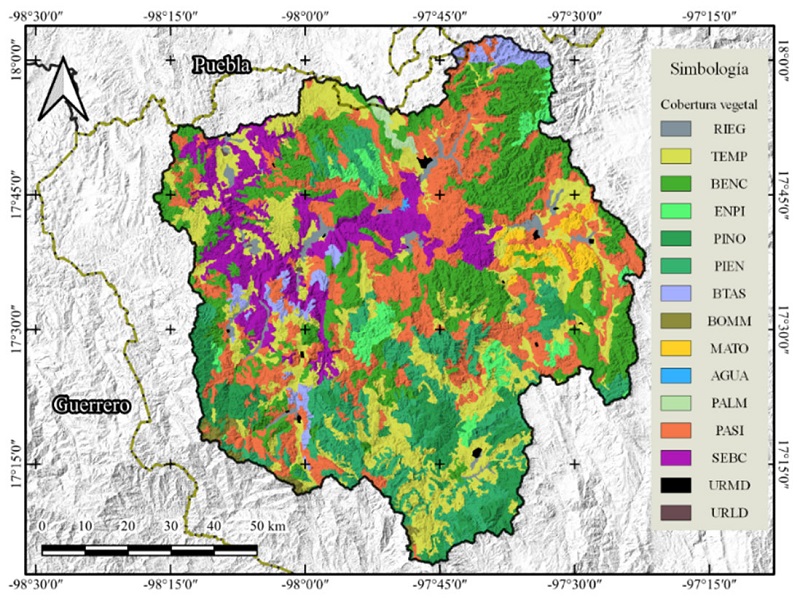 La distribución espacial de la cobertura vegetal para el periodo de calibración y validación, se obtuvo del conjunto de datos vectoriales de la carta de uso de suelo y vegetación de la serie IV, en escala 1:250 000, para la cuenca del río Mixteco (INEGI, 2009). En la Figura 3, se puede observar que la mayor parte de la cuenca está cubierta por algún tipo de bosque ocupando 44.95%; el más representativo es: Encino (BENC), seguido de Pino-Encino (ENPI), Pino (PINO), Encino-Pino (ENPI), Táscate (BTAS) y Mesófilo de Montaña (BOMM); las otras coberturas son Pastizal Inducido (PASI, 21.85%) , Agricultura de Temporal (TEMP, 19.02%), Selva Baja Caducifolia (SEBC, 10.06%) y el área restante, que es una superficie muy pequeña (4.12%), está cubierta por Agricultura de Riego (RIEG), Matorrales (MATO), Palmar Inducido (PALM), Cuerpos de Agua (AGUA) y Zona Urbana de baja y media densidad (URLD y URMD).