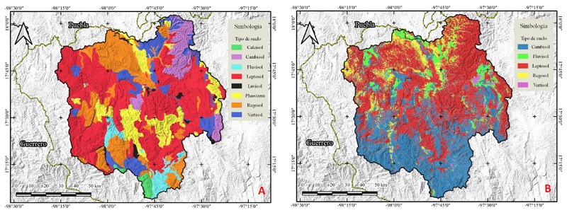 Durante la implementación del modelo SWAT se utilizaron dos fuentes de datos para la distribución espacial del tipo de suelo y sus propiedades. El primero fue la distribución espacial de los tipos de suelo reportados por INEGI, en la Serie II en escala 1:250 000 (INEGI, 2007); el segundo, fue el mapa de unidades de suelo generado por Colín-García et al. (2017) a través de covariables ambientales mediante la técnica de Mapeo Digital de Suelos (DSM) con precisión global de 76.67% y coeficiente kappa de 71.20%; ambos utilizan la Base Referencial Mundial del Recurso Suelo (WRB) de la FAO para su clasificación.