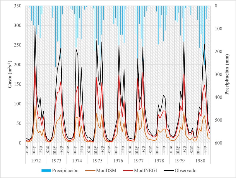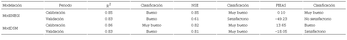 En el Cuadro 4 se despliegan los indicadores de evaluación, donde se observa que ambas modelaciones proporcionaron una adecuada predicción del comportamiento del ciclo hidrológico durante el periodo de calibración; sin embargo, durante el periodo de validación la ModDSM mostró una buena estimación del escurrimiento superficial de la cuenca (Moriasi et al., 2007).