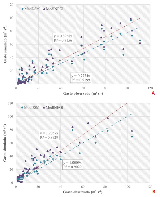 Durante el periodo de calibración, el gasto simulado utilizando ambas modelaciones, generó hidrogramas similares al gasto observado (Figura 5); la pendiente de la recta indica una subestimación global sobre los datos medidos de 10.42% para la ModINEGI y 22.26% para la ModDSM (Figura 6a). En cambio, durante el periodo de validación el gasto simulado utilizando ModDSM representó de mejor forma el hidrograma comparado con el gasto medio mensual observado; la pendiente de la recta indica sobreestimación global sobre los datos medidos de 20.57% para la ModINEGI y 0.09% para la ModDSM (Figura 6b).