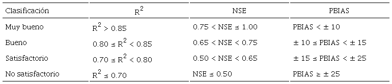 Para la evaluación del desempeño del modelo SWAT, se seleccionaron tres funciones objetivo Coeficiente de Determinación (R2), Índice de Eficiencia de Nash-Sutcliffe (NSE) y Sesgo Porcentual (PBIAS) que son ampliamente utilizadas en la modelación hidrológica (Panda, Das, Sahoo, Panigrahi y Singh, 2021); calculados a partir de las Ecuaciones 2, 3 y 4; en el Cuadro 2 se muestra la clasificación de desempeño.