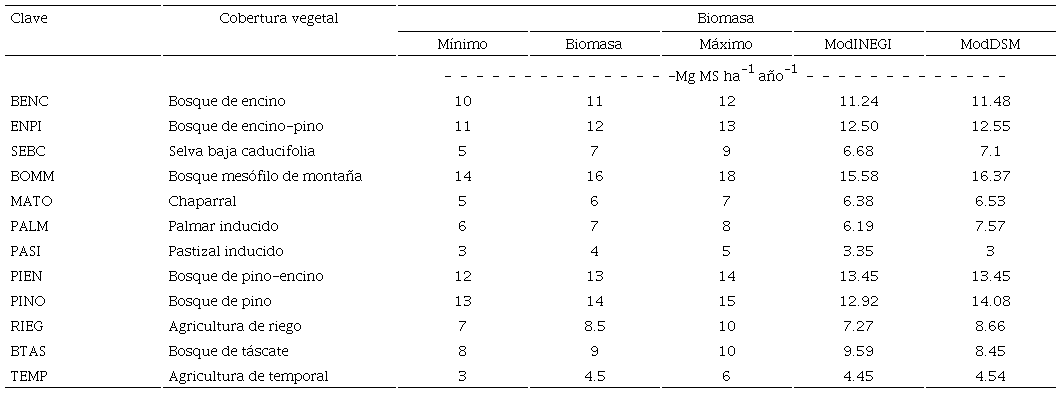 Para la producción anual de biomasa se obtuvo un coeficiente de determinación (R2) de 0.99 y valor de NSE de 0.98 usando la ModDSM; mientras que, para la ModINEGI, se obtuvo valor de 0.97 para ambos indicadores de evaluación. Por lo tanto, ambas calibraciones muestran buen comportamiento en la estimación de la producción de biomasa.