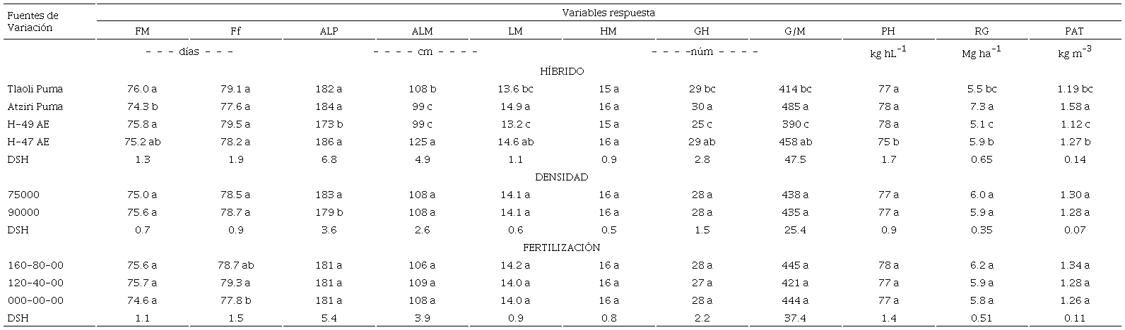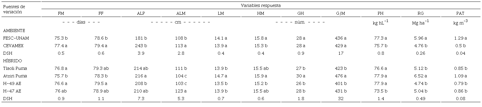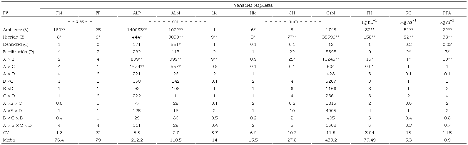 El ANDEVA factorial identificó efecto significativo del ambiente (P < 0.05), (Cuadro 1) en siete de las variables respuesta. El factor híbrido mostró efecto significativo en todas las variables respuesta; la densidad sólo afecto en la altura de mazorca y la fertilización afecto en rendimiento de grano y productividad del agua total. Las interacciones significativas fueron ambientes con híbridos (A × B) en ALP, ALM, LM, GH, G/M, PH y ambientes con densidades (A × C) para ALP, ALM.