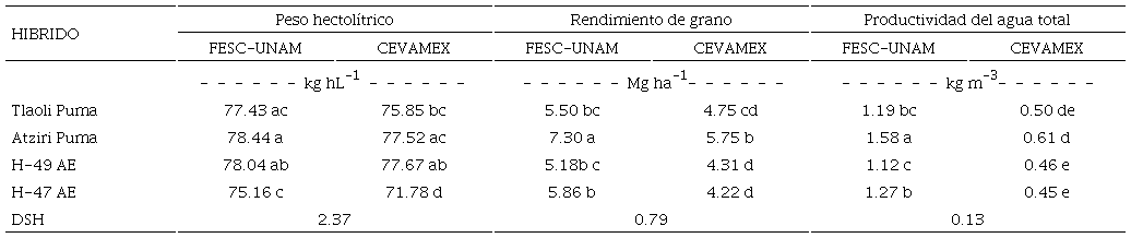 En la FESC-UNAM se observaron diferencias significativas en la floración masculina, el híbrido Atziri Puma resultó con precocidad mayor (74.3 días) con respecto a los otros híbridos. Las floraciones femeninas fueron iguales estadísticamente con media de 79 días. En altura de planta y mazorca sobresalió el H-47 AE (186 y 125 cm), con periodos de floración de 75.2 y 78.2 días. Las características de la mazorca fueron mejores en el híbrido Atziri Puma, además sus características de productividad fueron superiores con peso hectolítrico de 78 kg hL-1, rendimiento de grano de 7.3 Mg ha-1 y productividad del agua de 1.58 kg m-3. Los híbridos Tlaoli Puma y H-49 AE resultaron con medias de las variables de producción iguales, pero las más bajas significativamente (Cuadro 4). Los resultados de FF e HM donde no se presentó diferencia significativa se relaciona con la estabilidad de los híbridos y con la coincidencia de algunos de sus progenitores.