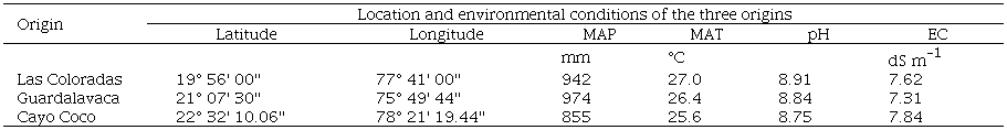 Sea grape seeds from three representative origins were collected in the northern and southern coastal areas of Cuba based on the presence of 40-year-old sea grape populations. The geographic location, annual precipitation, mean annual temperature, pH, and electrical conductivity of the soil of the selected origins are given in Table 1. Samples of 20 sea grape trees were randomly taken from each origin. Ripe fruits without damage or malformations were collected from different positions in the crown and placed in labeled plastic bags.