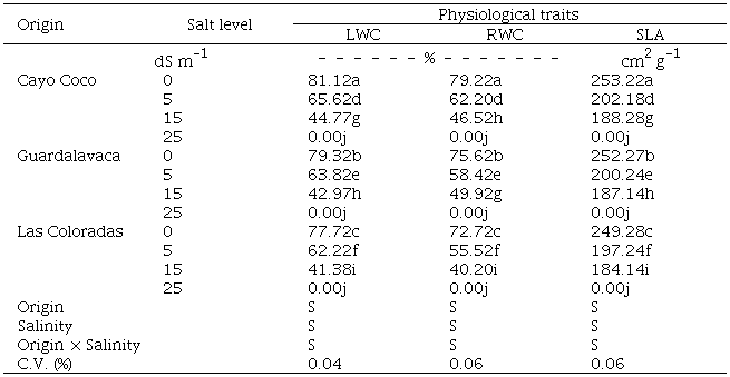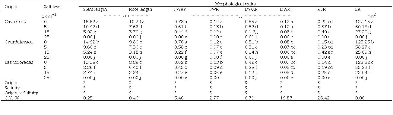 Salt stress had a negative effect on the morphological variables evaluated in C. uvifera seedlings. Significant differences (P ≤ 0.05) were observed in all traits as the salinity level increased. The highest level of salinity (25 dS m-1) caused the death of C. uvifera seedlings. The origin, salinity, and the interaction between origin and salinity had a significant influence on each of the traits analyzed (Table 2).