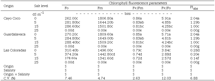 A sensitive indicator of photosynthetic activity in healthy and stressed plants is Fv/Fo (Li et al., 2010). The significant differences in the values of Fv/Fo between 0 and 5 dS m-1 in the seedlings of the three locations suggest that photosynthetic activity was affected by a slight increase in salinity, considering the high levels of salinity of the medium in which this species normally develops. The reduction of the value of Fv/Fo with the increase in the salinity level coincides with that observed by Kalaji et al. (2011), Khalid et al. (2015), Killi and Haworth (2017) and Pereira, de Siqueira, Martínez and Puiatti (2000) indicated that the reduction of Fv/Fo is a manifestation of structural damage in the photosynthetic apparatus, this causes damage to the efficiency of the photochemical processes and in the electron transport chain.