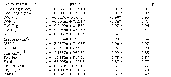 The correlation analysis between the traits evaluated and the saline stress levels (Table 5) showed that the correlation coefficient was highly significant and negative in all cases, therefore, the increase in the level of salinity will decrease the values of the variables evaluated. Except for RSR where the correlation coefficient between the evaluated traits and the salinity level was between -0.68 and -0.99.