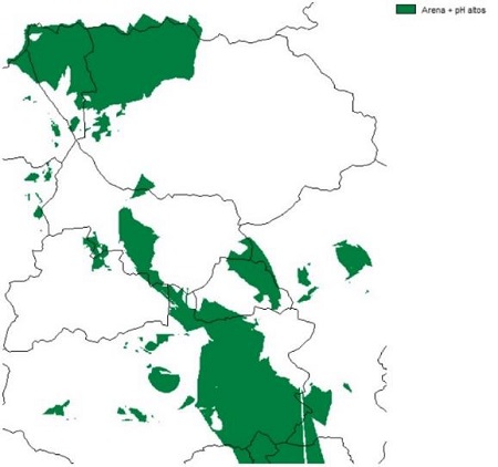 Al disponer de imágenes se genera una percepción de la distribución espacial que los parámetros estadísticos no pueden mostrar, en cambio, la información univariada genera una idea de homogeneidad y sin cambios en el espacio (Isaaks y Srivastava, 1989), (Cuadro 1). Sin embargo, al utilizar las imágenes y sobreponerlas entre sí, las coincidencias en algunas determinaciones ayudaron a identificar los cambios que se han presentado en partes específicas de la región estudiada. Dichos cambios se refieren a incrementos o disminuciones en algunas características y propiedades del suelo. Una porción de la superficie de suelo estudiada mostró valores de pH más altos que los valores medios medidos en 1976. Asimismo, los valores del porcentaje de arena se incrementaron, precisamente donde se encontraron los valores altos de pH del suelo. Al unir las superficies que coincidieron con pH alcalino y alto contenido de arena, se encontró que la superficie que presenta tales incrementos fue de 401 907 ha, y su distribución espacial se muestra en la Figura 1. Esta área, que es la más afectada por los cambios en pH y acumulación de arena incluye los municipios de Juan Aldama, Fresnillo, Río Grande y Cañitas, en el estado de Zacatecas.