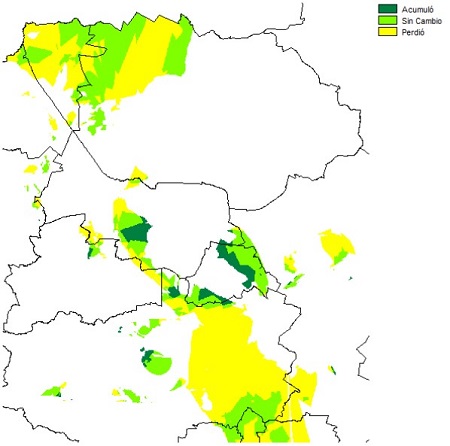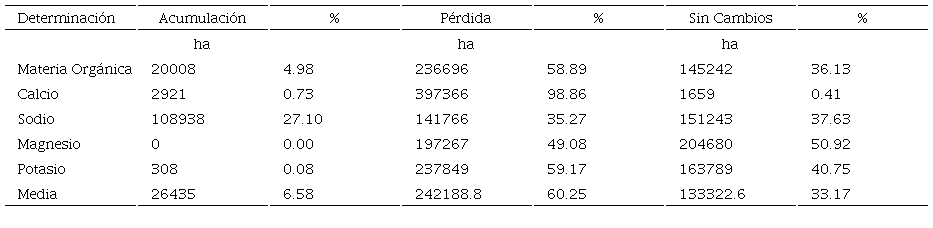 La disminución de gran importancia son las pérdidas de calcio en el 98% de la superficie de referencia, lo que parece contrario al incremento en el pH del suelo. Respecto al contenido de sodio, se observó una acumulación en el 27%, una pérdida en el 35% y sin cambios en el 37% de la superficie de referencia. La columna central del Cuadro 3 permite observar que las pérdidas en esta área seleccionada son importantes y representan un 60% de la superficie. En cambio, la acumulación es menor y sólo representa un 7% de la misma superficie.