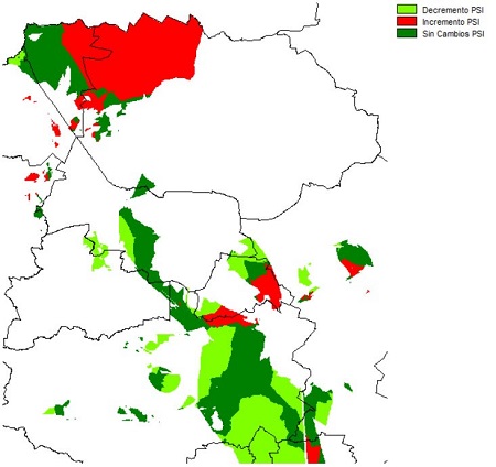 Por otro lado, dados los cambios de pH en el suelo, que en esta área son de 8.18 (Cuadro 2), ligeramente más elevados que el resto del terreno (7.40) Cuadro 1, se estimó la relación de absorción de sodio (RAS) y el porciento de sodio intercambiable (PSI). Los valores medios calculados de 1976 fueron más altos que los de 2016 (RAS = 0.41 y 0.35, PSI = 0.61 y 0.5, respectivamente) (Figura 3). La reducción de los valores de calcio y de sodio dentro del área seleccionada, indica que el riesgo de incremento de salinidad y sodicidad, ha disminuido con el tiempo y permite descartar que el incremento de pH del suelo sea provocado por salinidad o sodicidad. Por otro lado, al observar la distribución espacial de los cambios, los sitios donde el valor de PSI sufrió un decremento se localizan al sur de la imagen de referencia y los incrementos en valores de PSI se localizan al norte de la misma superficie (Figura 3), lo que sirve para ubicar los sitios donde se ha propiciado una pérdida o acumulación de cationes y es un indicio de que existe un patrón de cambios de sur a norte. Por otro lado, el potasio se perdió en el 59% del área y se mantuvo sin cambios en el 40%. En lo que respecta al magnesio, este se muestra sin cambios en el 51% y pérdidas en el 49% de la superficie de referencia.