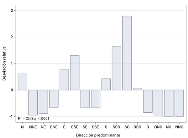Le siguen en importancia, los vientos predominantes que provienen del este-suroeste (ESE) y del Este en un 23.8% de los meses estudiados. Sumando las 4 direcciones mencionadas, se obtiene que un 61.6% de meses en los que el viento predominante en el estado de Zacatecas es del SO o del ESE. Además, al organizar por número de meses con la misma dirección predominante en las diez estaciones seleccionadas, nos muestra que en ocho meses (de octubre a mayo) el viento predominante fue con dirección SO y sólo de junio a agosto el viento predominante proviene del ESE y en el mes de septiembre, el viento que predomina proviene del E. Esto permite asegurar que existen vientos dominantes que se asocian con valores de erosión eólica que producen pérdidas de suelo en la parte sur del área de estudio y tales partículas de suelo al ser removidas, se han depositado al norte del área, las que aquí se han identificado como de acumulación de arena y que ha provocado cambio de pH.