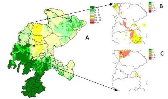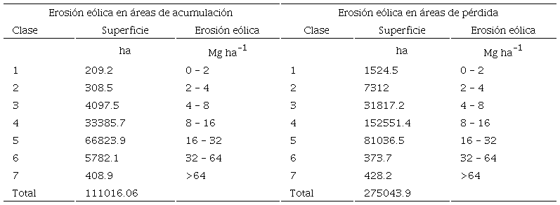 La superficie afectada por cambios de acumulación de arena y de pH del suelo, es de 401 907.3 ha (Figura 1), sin embargo, de acuerdo con la cartografía de uso del suelo y vegetación, serie V, de INEGI (2013), del total mencionado, al sobreponerse sobre la superficie de referencia, ésta se reduce a 199 753 ha dedicadas a uso agrícola (49.7%). De esta superficie dedicada exclusivamente a labores agrícolas, 38 670 ha son donde se presentan acumulaciones de los cationes estudiados y 151 356 ha es la superficie donde momentáneamente provienen las pérdidas de suelo. Si la superficie total de referencia son 401 907.3 ha, y sólo 199 753 son dedicadas a labores agrícolas, esto representa un 49.7% y el resto es de uso pecuario. Sin embargo, el proceso de remoción y traslado de partículas de suelo está presente en un área mayor, aunque afectando en menor proporción las áreas aledañas y aquí sólo se detecta el área con mayor afectación (Figura 6B y C),