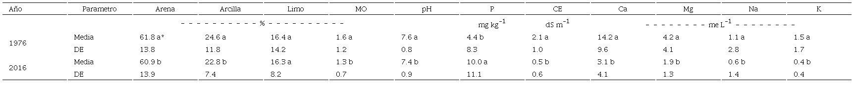 Las determinaciones de suelos realizadas en 1976 y 2016 en las que hubo coincidencia de métodos y unidades se presentan en el Cuadro 1, así como los parámetros de media y desviación estándar de cada determinación (n = 300). Existen diferencias significativas (P < 0.05) entre los años estudiados, presentando los valores más altos en el año 1976 en arena, arcilla, MO, pH, CE, Ca, Mg, Na y K, sólo el fósforo es más bajo en 1976 y el porcentaje de limo en la textura del suelo, presentó valores iguales (P > 0.05). Una interpretación preliminar del Cuadro 1, sería que, en 40 años, se ha presentado una disminución paulatina en los porcentajes de arena y arcilla, que la MO y pH, así como, los contenidos de los cationes analizados en ambos momentos (Ca, Mg, Na y K) y consecuentemente, también la CE han disminuido. Sólo el fósforo presenta valores más altos en 2016 y el porcentaje de limo se mantuvo igual. Sin embargo, el asociar los sitios de muestreo con las coordenadas geográficas y generar imágenes, se puede observar su distribución espacial, lo que proporciona una percepción diferente del fenómeno, lo cual no puede ser mostrado por los parámetros estadísticos como la media o desviación estándar (Cuadro 1). Al sobreponer las imágenes de 1976 y 2016, con ayuda del software utilizado (Eastman, 2012), se identificaron áreas comunes en las que se presentaron algunas coincidencias o contrastes entre imágenes de diferentes determinaciones.