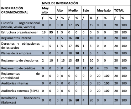 En el nivel alto de información con los que cuentan los socios, es la estructura organizacional (siendo el único elemento de alto nivel); los de nivel muy bajo se centran en las auditorías internas y externas; y el resto de variables están en promedio en un nivel medio de información. Referente a lo anterior, en la revisión de ciertos archivos, entre los más importantes está el Informe desarrollado por la SEPS en 2013, se describen 25 observaciones, entre otros aspectos, lo siguiente: