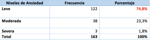 Los resultados del estudio concuerdan con una investigación llevada a cabo en la Universidad privada de Medellín en el 2015 en la cual se determinó la prevalencia de la ansiedad en los estudiantes, el 55% presentó un grado leve de ansiedad y 3% un grado moderada (Cardona et al., 2014). Los datos indican que en el ámbito universitario existe una tendencia de sintomatología de ansiedad leve en un mayor porcentaje de la población universitaria.