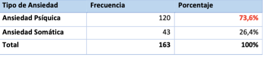 El 73,6% de la muestra presenta síntomas de ansiedad psíquica como: tensión, temores, insomnio, dificultad de concentración, estado de ánimo depresivo entre otros, que causan malestar significativo, datos que concuerdan con un estudio realizado a los egresados en proceso de titulación de la Facultad de Ciencias Humanísticas y Sociales sobre la ansiedad, que reveló la prevalencia de la ansiedad psíquica en un 75% de la muestra (Cedeño & Ponce, 2018).