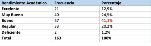 En la tabla N°3, revelar la ponderación del rendimiento académico de los estudiantes de la escuela de Psicología de la Universidad Técnica de Manabí, los resultados de las ponderaciones fueron los siguientes: 41,1% presentan un buen rendimiento académico, el 24,5% obtuvo muy buen rendimiento, el 20,2% obtuvo un rendimiento académico regular, el 12,9% obtuvo un rendimiento académico excelente y finalmente el 1,2% obtuvo un rendimiento académico deficiente. Después de analizar estos resultados, se identifica que la mayoría de estudiantes tienen un buen rendimiento académico tomando en cuenta las calificaciones del Sistema de Gestión Académica (SGA).