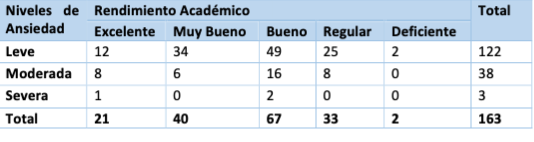 Por otro lado, con ansiedad severa; 2 estudiantes obtuvieron un buen rendimiento académico y 1 obtuvo un excelente rendimiento académico.