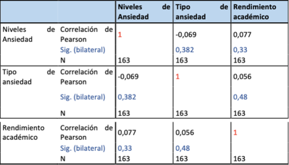 El objetivo planteado, determinar la relación de la ansiedad en el rendimiento académico de los estudiantes de Psicología, reveló la correlación entre ambas variables, según el coeficiente de Pearson p=0,077, con un nivel de significancia bilateral menor al 0,05, sin embargo, a pesar de que el 74,8% de los estudiantes presentan ansiedad de tipo leve, 23,3% de tipo moderada y 1,8% de tipo severa que en determinados momentos puede afectar el desempeño, este no se ve reflejado en las calificaciones de los mismos, pues de los 163 estudiantes, 128 de ellos, presentaron rendimiento académico que va de bueno a excelente y 35 de regular a deficiente.