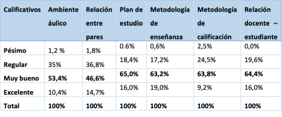 En relación al clima áulico los resultados indican que la mayoría de los estudiantes consideran que es muy bueno ya que el ambiente en el que se desarrolla la clase, la relación entre pares, los planes de estudio de las asignaturas, las metodologías de enseñanzas, las metodologías de calificaciones y la relación docente-estudiante favorece el aprendizaje. Estos resultados concuerdan con un estudio de México relacionado a los factores que inciden en el clima áulico universitario, la opinión fue positiva en todas las dimensiones: dominio de contenido por parte de académicos, relación interpersonal docente-estudiante, metodología de clase, la práctica evaluativa, en sí, el clima áulico es definido como una expresión de las percepciones que tienen los participantes acerca del ambiente de la clase y la mezcla de diversos aspectos (Ríos, Bozzo, Marchant, & Fernández, 2010).