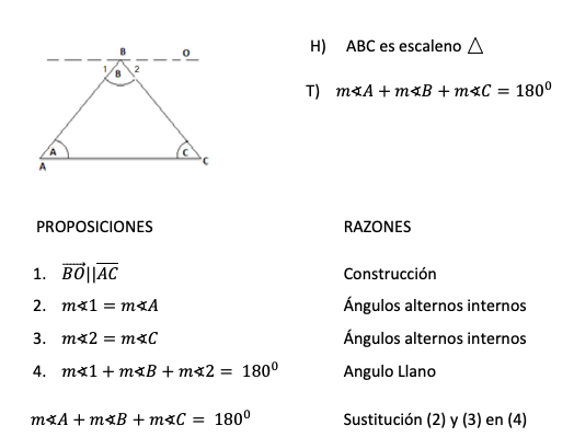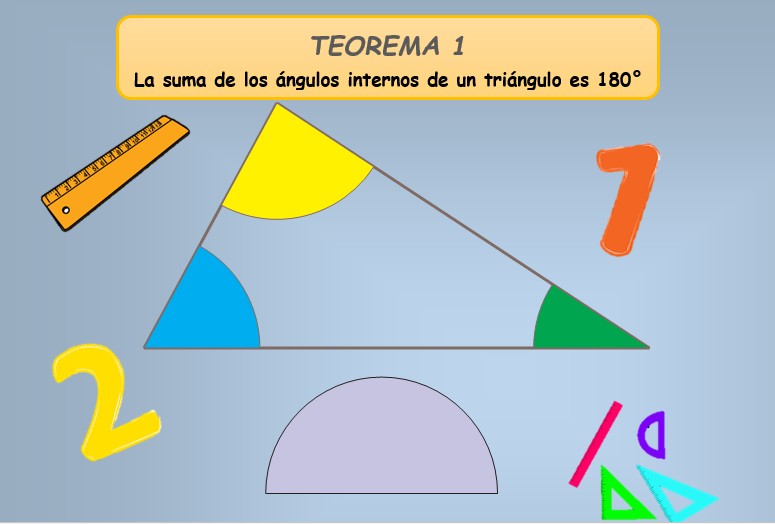 Teorema 1: En todo triángulo la suma de las mediadas de los ángulos internos es 180o.