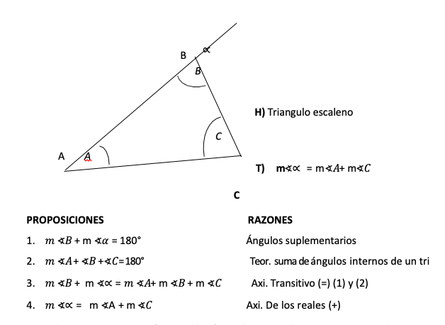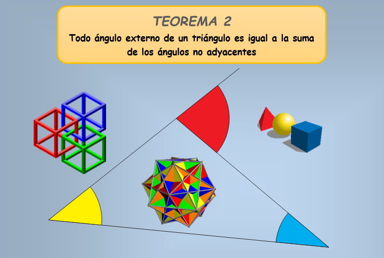 Teorema 2: Todo ángulo externo es igual a la suma de las medidas de los ángulos internos no adyacentes y por lo tanto es mayor a cada uno de ellos.