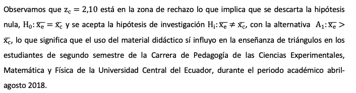 Hipótesis nula (Ho): El uso del material didáctico no influye en la enseñanza de triángulos en los estudiantes de segundo semestre de la Carrera de Pedagogía de las Ciencias Experimentales, Matemática y Física de la Universidad Central del Ecuador, durante el periodo académico abril-agosto 2018.