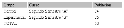 Para Galindo (2010) una población es una colección completa de personas, animales, plantas o cosas de las cuales se desea recolectar datos. El grupo entero al que queremos describir o del que deseamos sacar conclusiones. (p. 3), dentro de este marco la población que participo en la presente investigación es finita y accesible; siendo estudiantes del segundo semestre de la Carrera de Pedagogía de las Ciencias Experimentales Matemática y Física de la Universidad Central del Ecuador, distribuido en dos grupos; el grupo experimental (Paralelo B, sección vespertina) con 26 estudiantes y el grupo control (Paralelo A, sección matutina) con 24 estudiantes.
