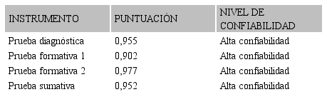 En concordancia con Hernández Sampieri, Fernández Collado, & Baptista Lucio (2014), toda medición o instrumento de recolección de datos debe reunir tres requisitos esenciales: confiabilidad, validez y objetividad” (p.200), para la validez y confiabilidad de los instrumentos de evaluación, se aplicó una prueba piloto con cada evaluación (diagnóstica, formativa 1, formativa 2 y sumativa) a 14 estudiantes de un semestre superior y con los resultados obtenidos se calculó el coeficiente de confiabilidad mediante el método del Alfa de Cronbach.