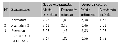 En cuanto a los resultados de las evaluaciones formativas y sumativa son resumidos en la siguiente tabla: