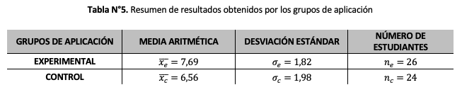 Tabla N°5. Resumen de resultados obtenidos por los grupos de aplicación