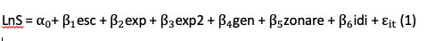 Las variables se representan de la siguiente manera: LnS=Logaritmo del nivel de salarios (Salario en dólares del trabajador por hora); esc= instrucción por años aprobados de educación; exp= años laborados/trabajador. Con la finalidad de corregir endogeniedad y adaptar al modelo extendido las singularidades del país se añadió las variables género, zona de residencia y habilidad en otro idioma. Las variables se describen así: gen= variable dicótomo género (masculino femenino), zonare= variable dicótoma (zona de residencia del trabajador urbano - rural), idi=variable dicotómica (tiene o no tiene habilidad en otro idioma)