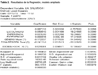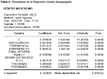 En el modelo original Minceriano se adicionó además la variable dummy idioma que especifica si los individuos hablan o no otra lengua adicional a la nativa, resultando que del total de individuos que hablan más de un idioma, el 53,48% corresponden al género masculino, con respecto al 46,52% de las mujeres que lo hacen. Por otro lado, del total de trabajadores que llegaron al término del nivel secundario, el 63,64% corresponde al género masculino y el 36,36% al femenino, demostrando la disparidad en cuanto a la discriminación de género que existe al acceso hasta un nivel secundario; por otro lado, al describir analíticamente los datos proporcionados en cuanto a los trabajadores que cuentan con formación universitaria de pregrado y postgrado no existe diferencia significativa, ya que las proporciones son como siguen: 45,09% /hombres/pregrado; 45,73%/mujeres/pregrado; 4,21%/hombres postgrado; 4,97%/mujeres/postgrado.