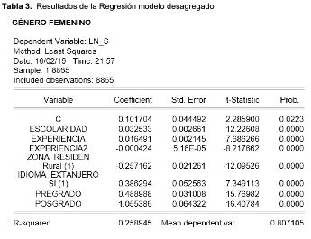 Se utiliza también dos modelos desagregados de la variable género como variable explicativa del nivel de salario – hora, para el género masculino y género femenino midiendo además la influencia que ejerce sobre la variable dependiente el poseer o no título de pregrado que considera hasta los 23 años de estudio y de postgrado que eleva este nivel a 26 años cursados y aprobados; estos modelos permitirán obtener un claro diagnóstico de la influencia de las variables que incluyen al género, ya que previamente se estableció la discriminación existente entre ellas.