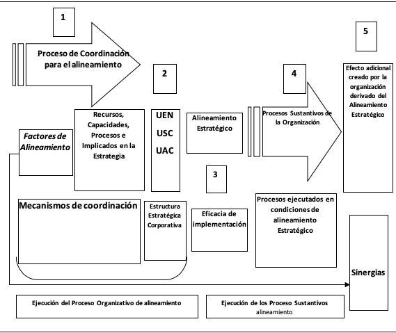 En un estado de alineamiento estratégico, la organización acomete la ejecución de sus procesos sustantivos en función de su Misión, sobre la base de un estado superior de coordinación. Esto significa que las relaciones y acciones se establecen en función de la estrategia de las unidades de negocio y de la estrategia general, pues se parte de la convicción de que es posible generar resultados superiores a partir de mejoras entre relaciones organizativas, que impliquen ahorro de recursos, aprovechamiento de capacidades y/o generación de nuevas, además de incrementos en el rendimiento y la eficiencia. De tal manera, el alineamiento estratégico es identificado como acciones de coordinación entre los recursos, las capacidades, los procesos y los implicados en la estrategia.