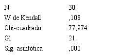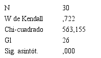 Asumidas las mismas hipótesis, se comprobó el nivel de acuerdo entre los expertos: Nuevamente el valor de significación es menor que el nivel de significación = 0,05 por lo que se rechaza la hipótesis de nulidad, es decir, sigue existiendo acuerdo entre los expertos. Se consideraron válidos los factores cuyas moda y mediana consiguieron una evaluación superior a 4 en las escalas de 1 a 5 utilizada. Esta vez, las evaluaciones de los expertos, para todos los factores estuvieron entre 4 y 5, lo que mostró una mayor pertinencia de los criterios propuestos.