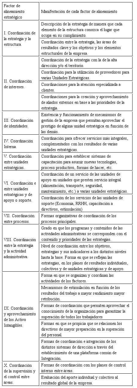 Entre los factores de alineamiento encontramos los recursos, las capacidades, los procesos y los implicados en la estrategia, que dentro del proceso de coordinación se manifiestan en la estructura organizativa, especialmente en aquellas subdivisiones que tienen un determinado significado para la Estrategia. Los procesos de coordinación pueden aplicarse dentro de las Unidades Estratégicas (UEN), en las de Soporte (USC) o de Apoyo (UAC), o en procesos entre distintas Unidades, siendo el resultado final un estado de Alineamiento en la organización. Algunos autores señalan que cuando éste estado, a través de un proceso de interiorización, se convierte en una convicción entre los miembros de la organización, puede ser reconocido como un valor compartido (González, 2013).